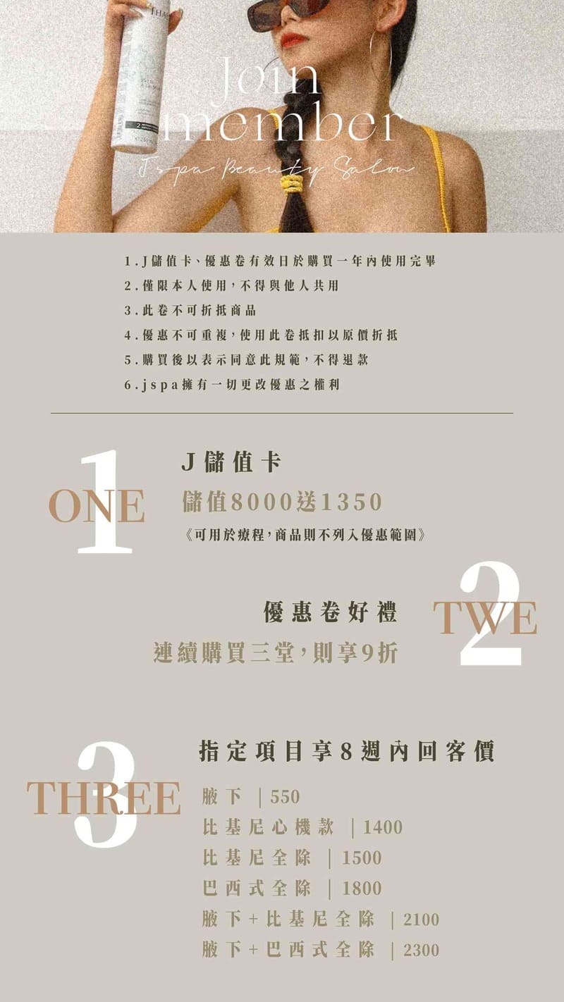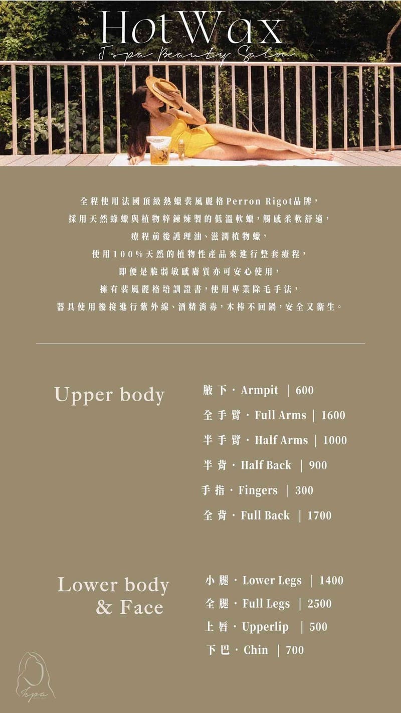 Q&A 除毛小教室 Q1:熱蠟除毛會痛嗎? A1:熱蠟除毛在上蠟上會有溫熱感,撕除瞬間會有微痛感,疼痛程度會依個人耐痛力有所差異,jspa能提供專業的手法減輕疼痛感。第一次除毛時一定會比較有感覺,會隨著除毛的次數疼痛感逐漸會減少 Q2:熱蠟除毛後是都不會再長嗎?要幾次可以完全不再長? A2:其實目前並沒有永遠讓毛髮停止生長的方式,而熱蠟除毛是屬於半永久性除毛,熱蠟除毛能達到減少毛量、讓新生毛細、短、小的效果、越除越少。除毛後,完全無毛狀態大約是1-2週,但還是要看個人的毛髮生長速度!建議定期回來除時間,大約是6-10週的生長期,會依照每個人的生長速度不同,時間有所調整! Q3:熱蠟除毛跟其他除毛方式的差異在哪? A3:以下比較了一些常用的除毛方式,簡單來說除毛刀和膏都不要用! 如果你想要馬上光溜溜,請選擇熱蠟。 如果想要毛量瞬間減少但有毛沒關係,請選擇雷射。 沒有誰比較好,都很好,只差在除完的感覺和效果不同! 除毛表格 Q4:除毛前需要準備什麼嗎? A4:完全不用喔,只需要帶個小塑膠袋裝原本的舊內褲,其餘的只需要帶個愉快的心情即可! Q5:我生理期來可以除毛嗎? A5:是可以的!但第一次除毛,會建議避開生理期,因為第一次會比較有感覺,如果除了好幾次身體也不會不舒服,會建議你塞棉條,也可以進行操作。 Q6:除完皮膚紅紅的是正常的嗎? A6:是低!我們選用的是Perron Rigot,脆弱敏感膚質亦可安心使用,每個人對於蠟的反應不一樣,些許人會紅個2-3天之後會漸漸退紅,都是屬於正常現象! Q7:我皮膚過敏能除毛嗎? A7:如果有過敏的現象不建議喔,請諮詢專業的醫生,等皮膚穩定了,再來除毛喔! Q8:孕婦可以用熱蠟除毛嗎? A8:可以的,適合除毛時間為懷孕滿四個月後到預產期前2-3周左右, 並且諮詢醫生寶寶狀態能否進行熱蠟除毛。