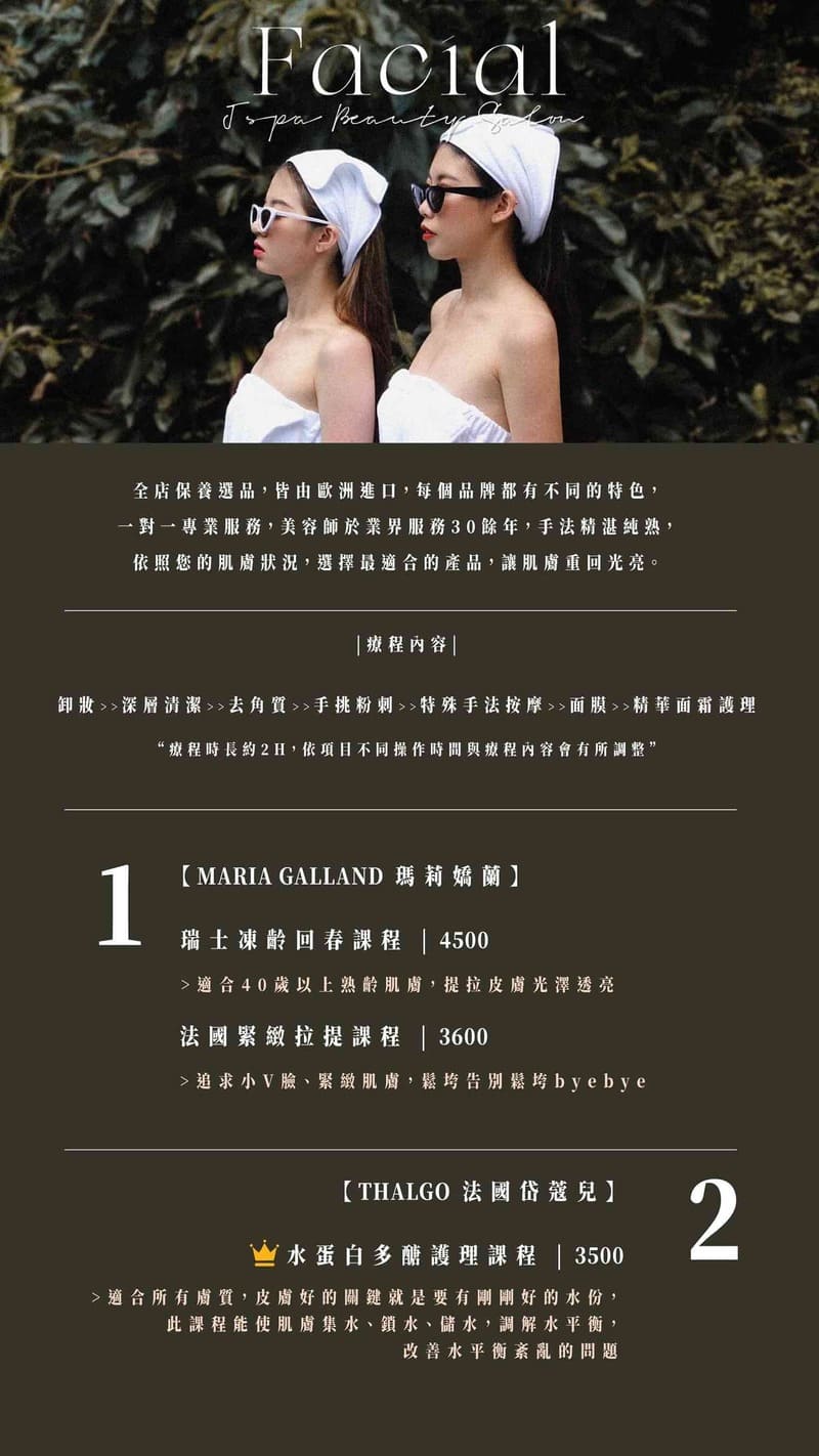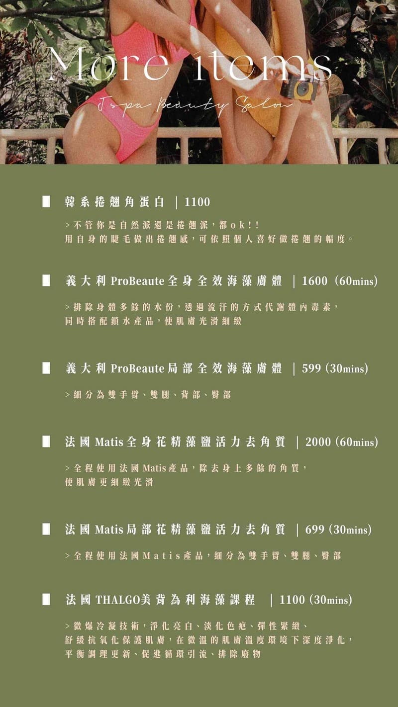 About JSPA 關於我們 寵愛自己,您的美麗,讓我們為您守護, 與您一起漂亮過生活! Love yourself, To be unique, irreplaceable and beauty Jspa beauty salon正式成立於2020年,是由一對可愛的母女一起所創建的,媽媽是在美容界深耕30餘年的資深美容師;女兒是在大學時自己成立自己的除毛品牌。希望透過跨時代的結合,突破傳統美容產業的框架,帶給大家不同以往的體驗! 服務項目: 熱蠟除毛|臉部保養|角蛋白 身體SPA|場地租借